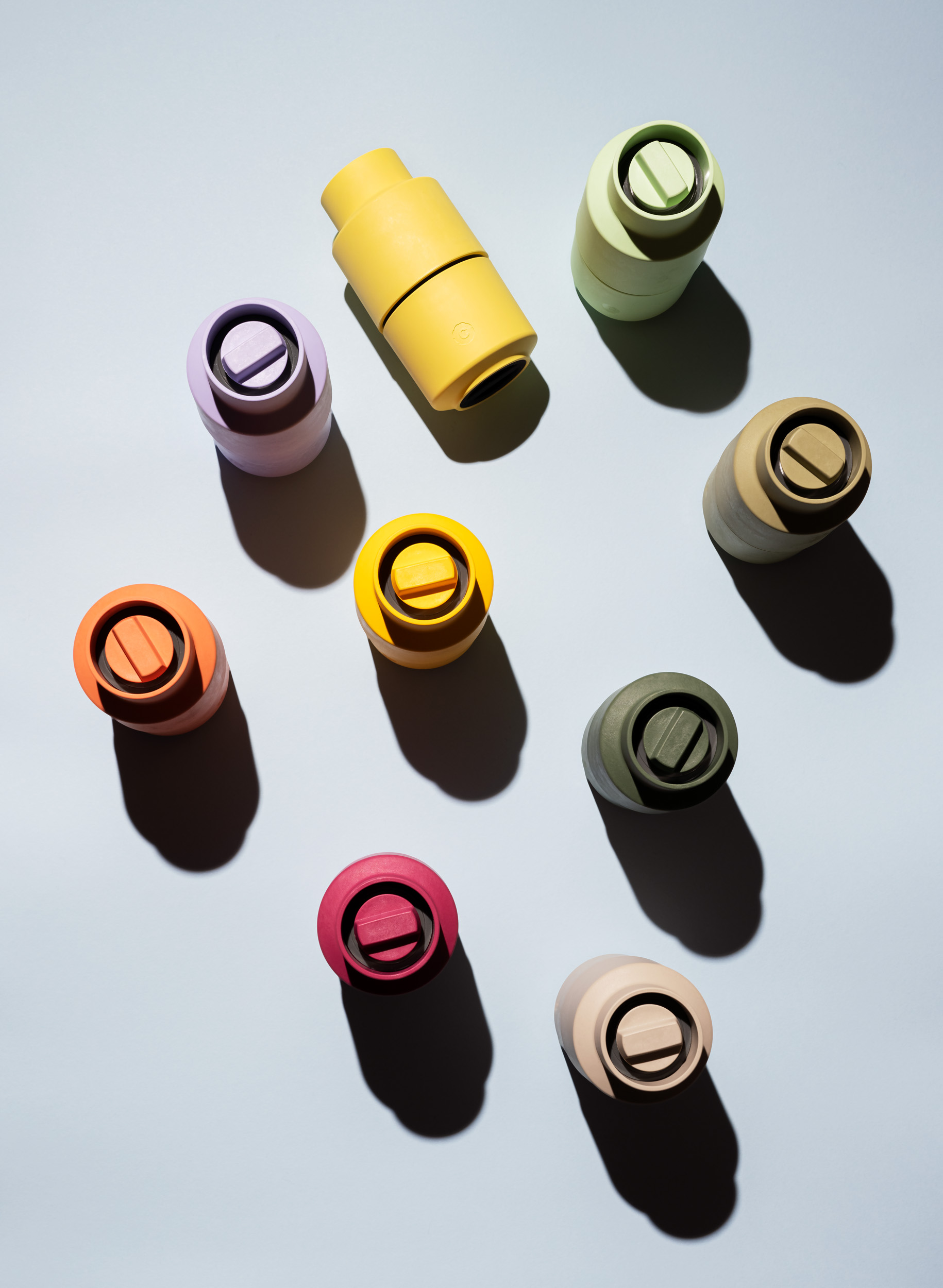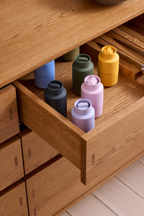 Gemaakt van een houtgebaseerd biocomposiet uit duurzaam beheerde bossen. Hierdoor heeft elke molen een unieke textuur.